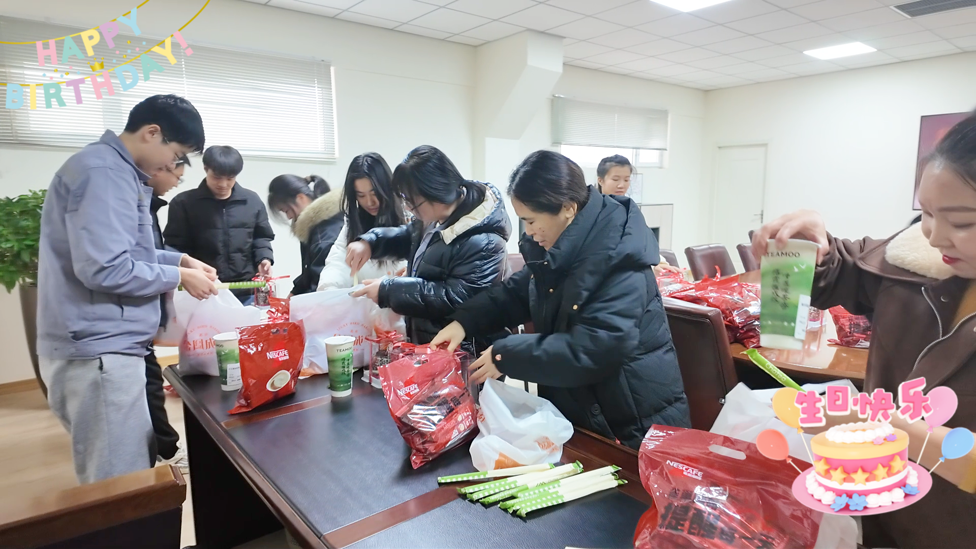 準(zhǔn)備了蛋糕和暖心咖啡、奶茶等暖心飲品。